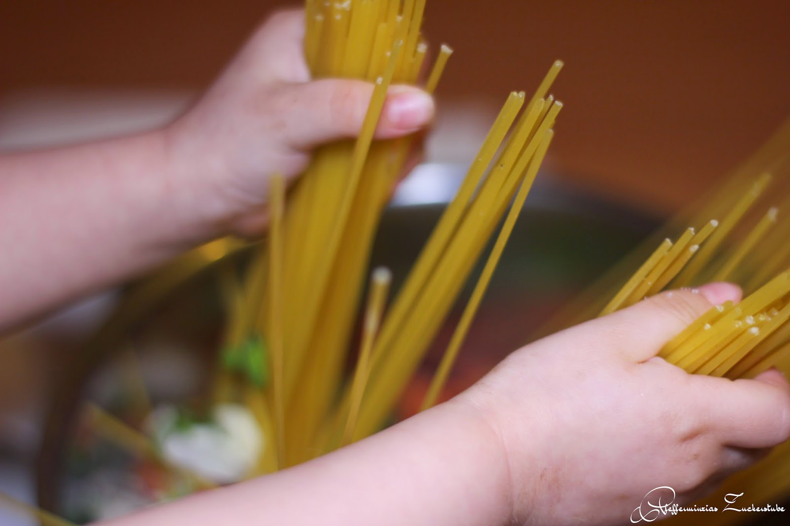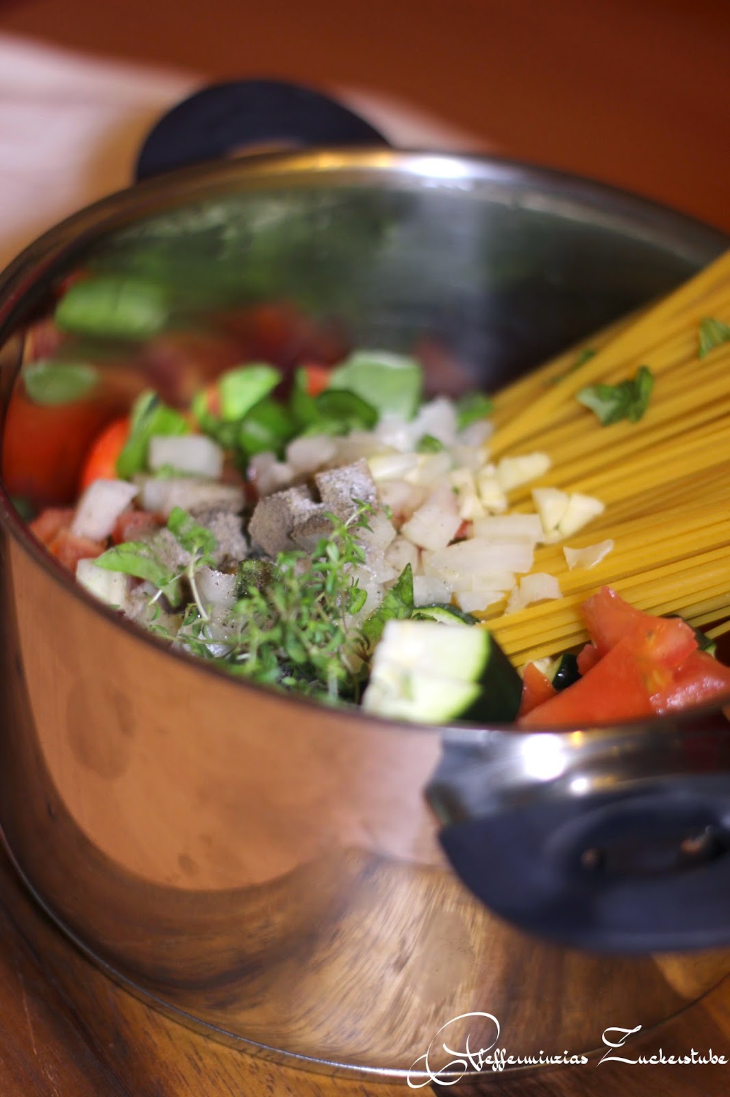 Die Spaghetti in den Topf geben, notfalls in der Hälfte brechen. Zwiebel und Knoblauch schälen, kleinhacken und mit in den Topf geben. Tomaten und Zucchini gut abwaschen, in Stücke schneiden und auch mit in den Topf geben.