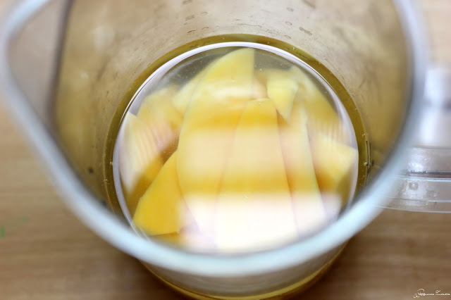 Die Mango schälen und in Stücke schneiden. Die Mangostücke zusammen mit dem Wasser in das Püriergefäß geben und alles gut pürieren. Die Flohsamenschalen hinzugeben und nochmal kurz pürieren, nur so lange bis sich alles miteinander vermengt hat.