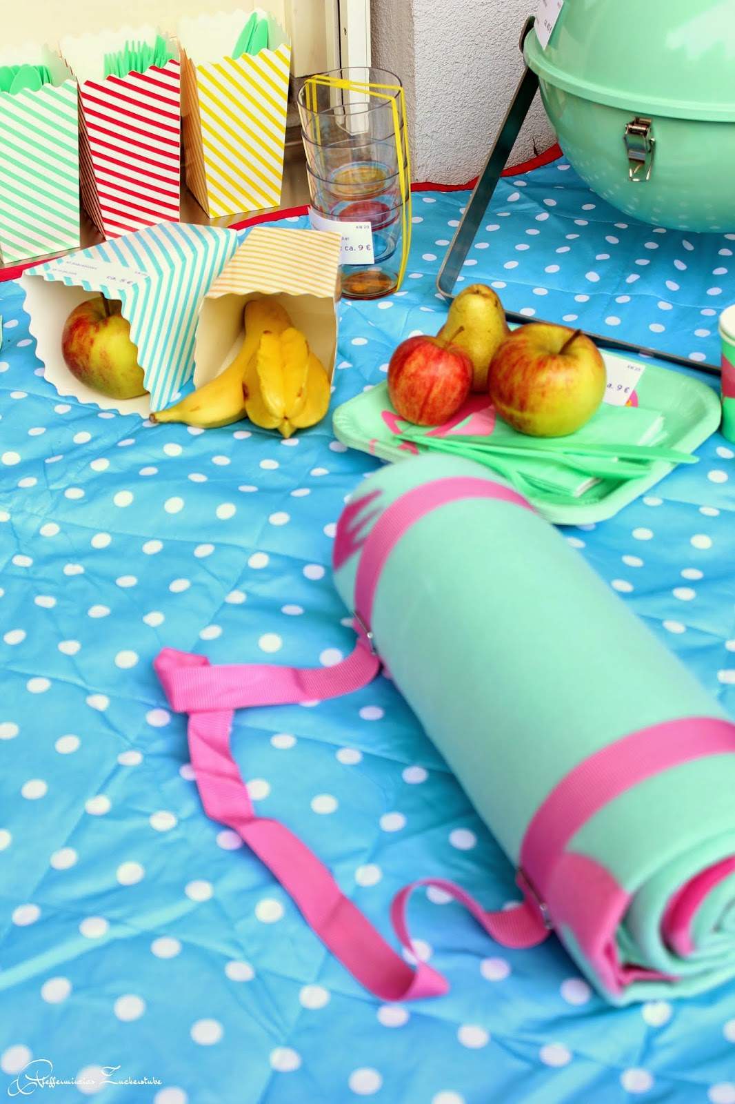 Besonders gefallen mir der Kugelgrill in mint, er ist auch noch in taupe erhältlich, das passende (Papp-)Party-Geschirr mit pinken Flamingos drauf (kein Abspülen des Geschirrs nach der Grillfeier.) und die 3-IN-1-Picknickdecke, mit einer Größe von ca. 150 x 180 cm bietet sie eine schöne Sitz- und Liegefläche und sie ist sehr klein zusammenfaltbar, praktisch für unterwegs.