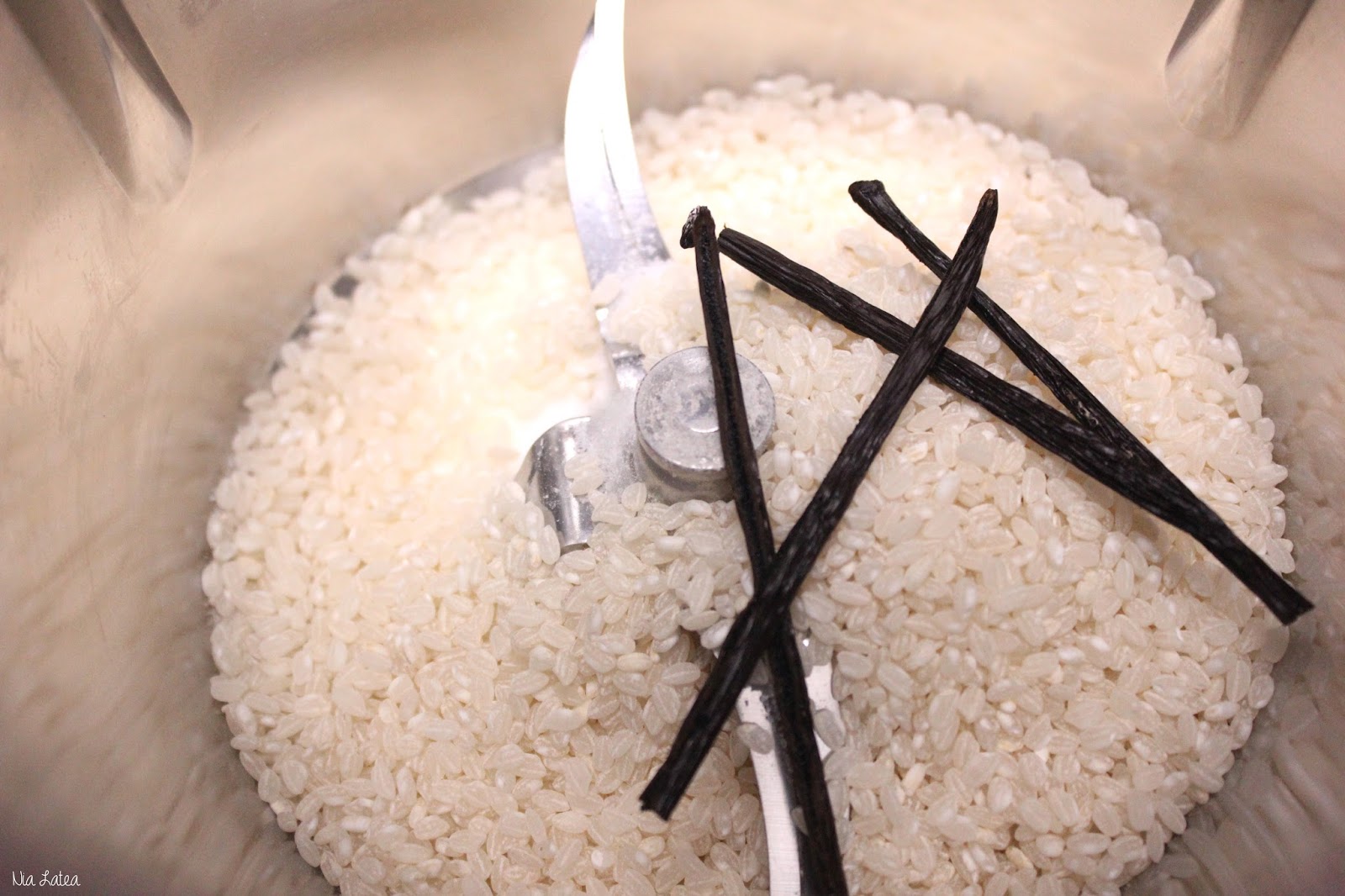 Meersalz, Zucker, Vanillezucker, Milchreis und die Vanilleschote (aufgeschnitten und halbiert) in den Mixtopf geben. Alles für 30 Sekunden /-/ auf Stufe 10 zerkleinern.