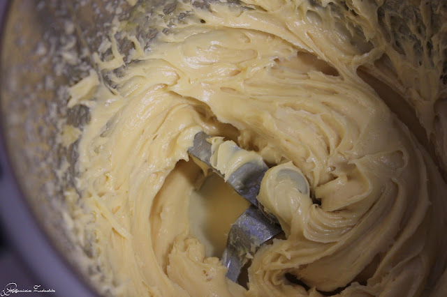 Die Zitronenschale durch die Deckelöffnung hinzugeben. Nach und nach die Eier (auch durch die Deckelöffnung) hinzugeben, pro Ei mindesten 40 Sekunden verrühren lassen. Anschließend, damit die Masse schön glänzt und gut verrührt ist für 30 Sekunden auf Stufe 5 verrühren.