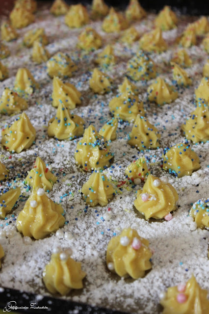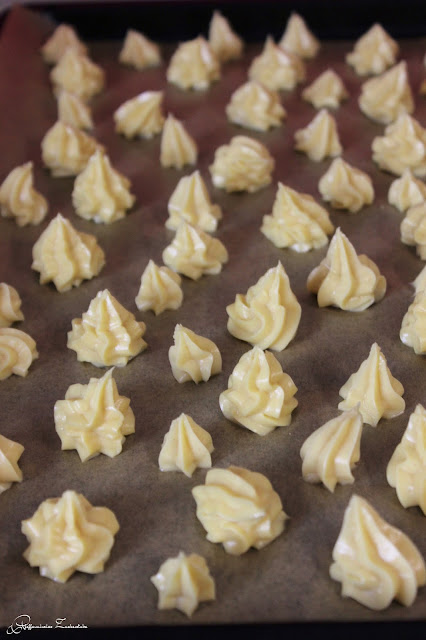 Auf ein mit Backpapier belegtes Backblech kleine Kugeln spritzen. Sie können ungleich aussehen, egal ob klein, groß, mit viel Teig oder mit wenig Teig, dass tut dem Geschmack keinen Abbruch. 🙂