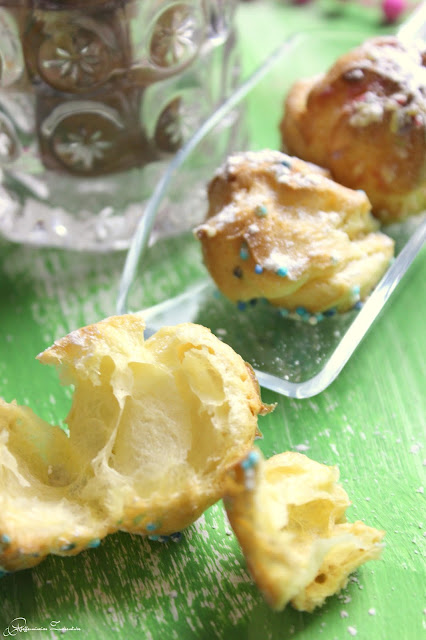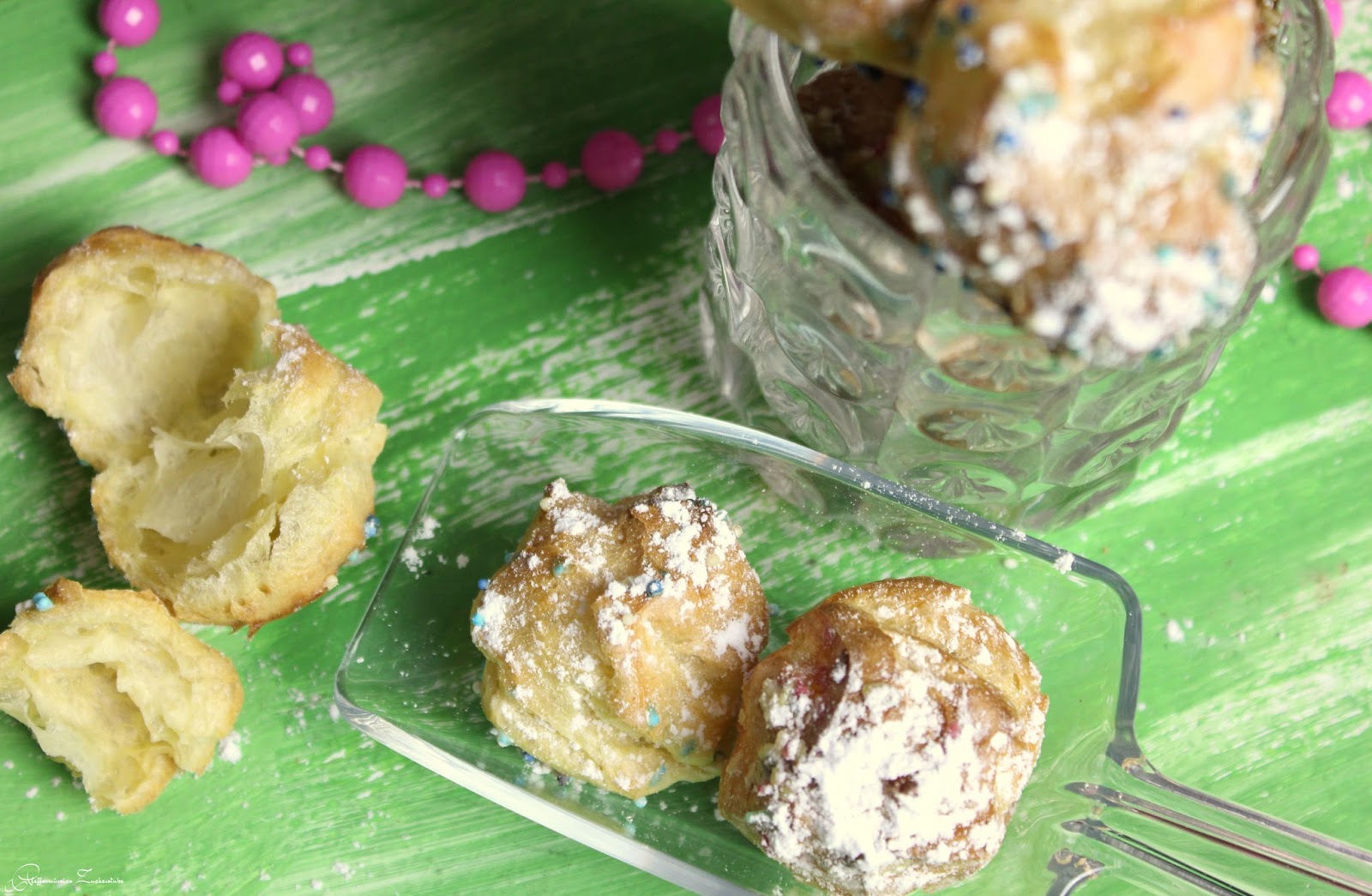Chouquettes sind kleine Kugeln aus Brandteig, die mit Staubzucker(Puderzucker) bestäubt und Zuckerperlen garniert werden. Sie kommen aus Frankreich und dürfen auf keiner Teeparty fehlen.