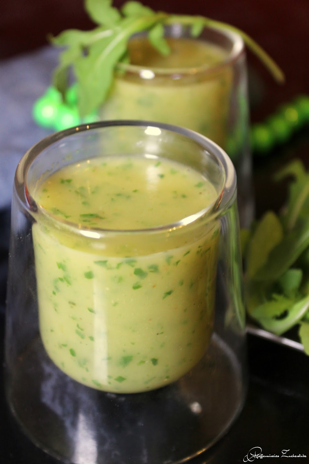 Lauwarme Kartoffelsuppe mit Rucola (vegan)