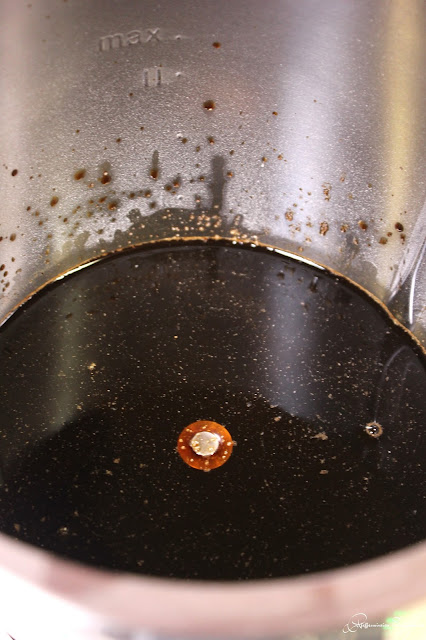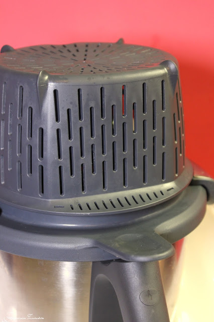 Für 18 Minuten /100°C/ Stufe 2 köcheln lassen. Ohne Messbecher, ich gebe den Gareinsatz als Spritzschutz auf den Thermomix.
