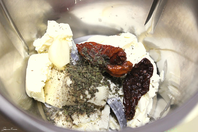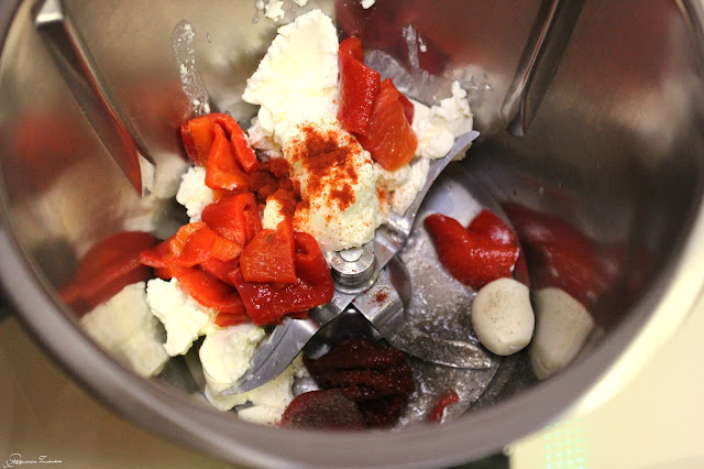Alle Zutaten in den Mixtopf geben. Ich habe die gegrillte, eingelegte Paprika mit dem Messer vorher etwas klein geschnitten. Anschließend für 6 Sekunden /-/ auf Stufe 6 zu einem Dipp verarbeiten. In eine Schüssel abfüllen und kühl stellen.