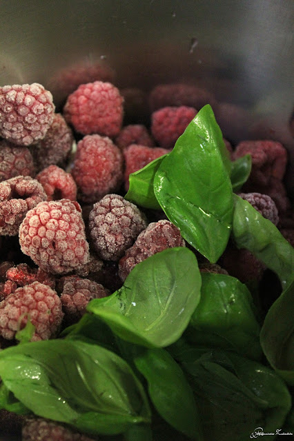 Himbeeren und Basilikumblätter in den Mixtopf geben.