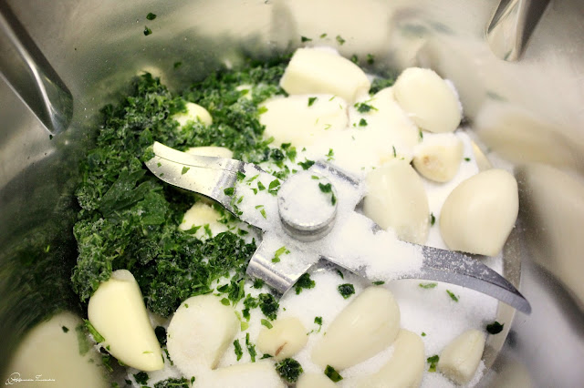 Manchmal wünsche ich mir der Tag hätte mindestens 28 Stunden. Zur Zeit komme ich zu fast nichts, immer ist etwas zu tun. Ich bin sooo froh, dass es bald in den Urlaub geht. Erst habe ich mir sogar überlegt ob ich den Thermomix mit in den Urlaub nehme. 😀 Viele machen das ja. Sie können wie gewohnt kochen, sparen Geld, weil sie nicht so viel auf Restaurants angewiesen sind und sparen Zeit. Da ich allerdings mit den Kindern alleine fahre, der Mann bleibt Zuhause, kann ich nicht neben dem Gepäck und den Kinderhänden den Thermomix tragen. 🙁 Ich werde den Thermomix sehr vermissen, aber wenigstens kann ich mir ganz sicher sein, dass mein Mann nicht verhungert. 😀 ♥ Dafür, auch um die Trauer nicht zu groß aufkommen zu lassen, nehme ich mir Pasten und Gewürzmischungen, hergestellt mit dem Thermomix, mit. Schon eingepackt ist eine Knoblauch-Petersilien-Paste, denn Knoblauch benötige ich so gut wie täglich, möchte allerdings keinen Knoblauchgeruch an meinen Fingern haben und auch auf das Schälen und Kleinschneiden verzichten.