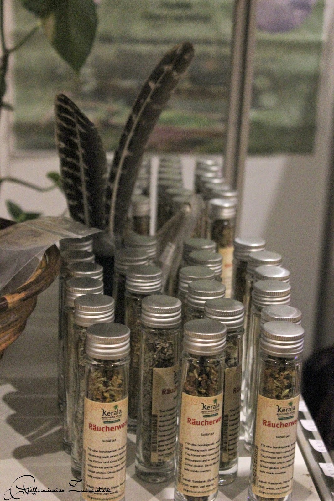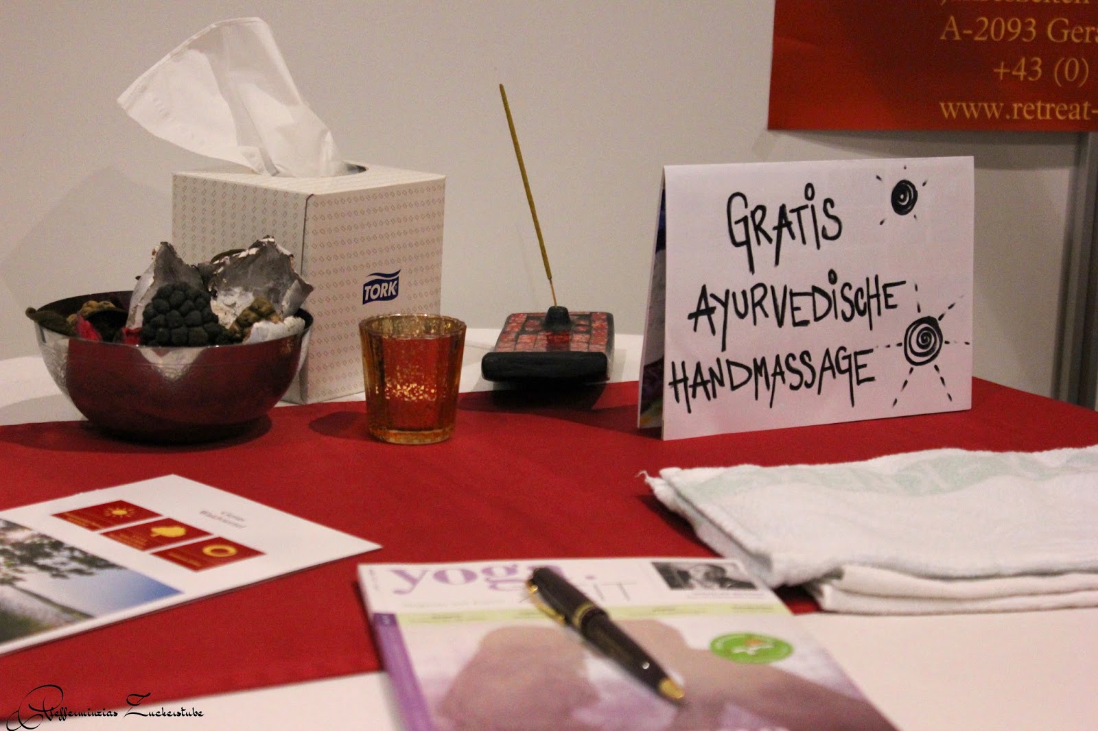 Meine letzte Station war das Yoga und Ayurveda Vierjahreszeiten Retreat Waldviertel. In der Luft lag ein Gewürzduft, der mich die ganze Messe über begleitete. Ich liebe Räucherstäbchen, Gewürzöle und den Duft von Blüten. Die liebe Teresa, die dort am Stand arbeitete, hatte ein Kurkumaöl, mit dessen sie den Besuchern eine ayurvedische Handmassage anbot.