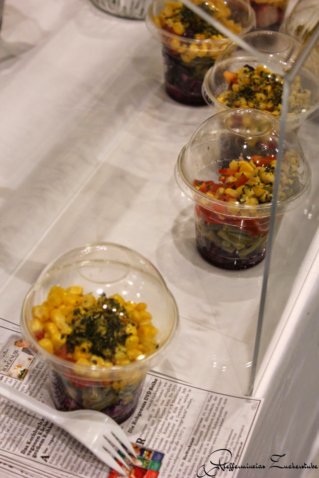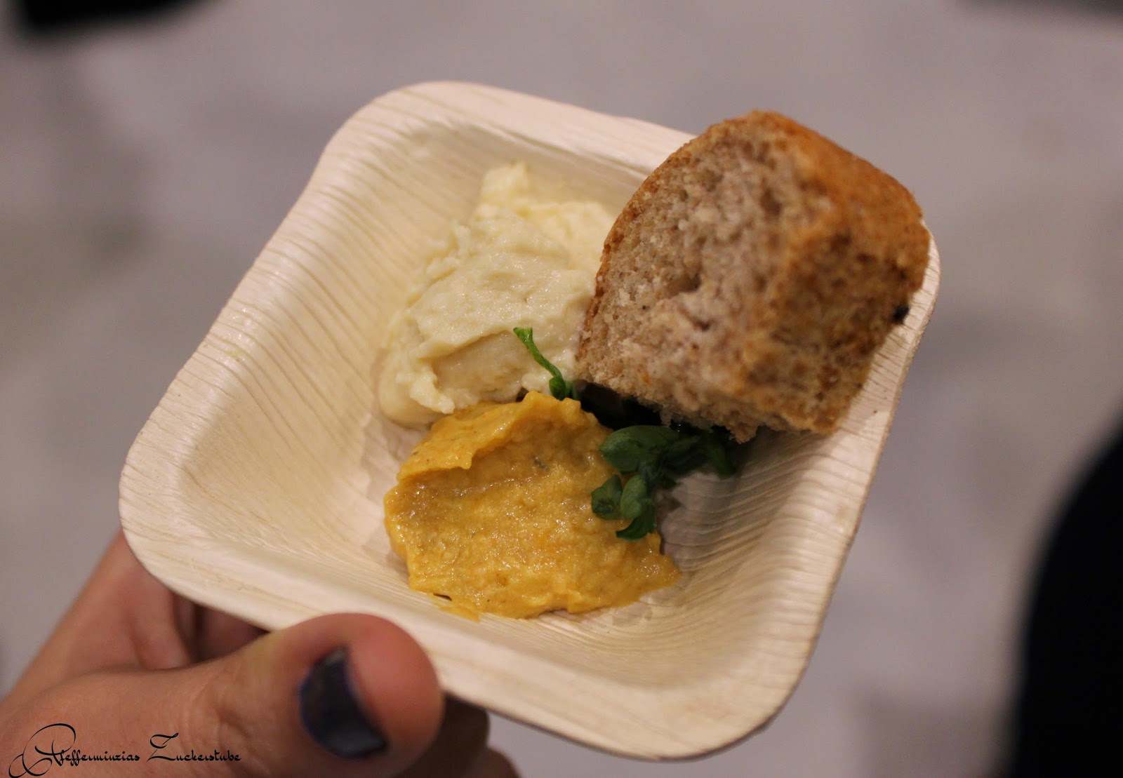 Das Essen war wirklich köstlich und preislich auch sehr gut vertretbar. In vegane Facebookgruppen waren einzelne User unglücklich über die Essensauswahl, vielleicht haben sie sich mehr erwartet, aber ich fand das Angebot von veganen Burgern, Salat, gebratenen Gemüse und noch einigen anderen Speisen super. Man musste sich nicht Stunden durch eine Speisekarte wühlen, denn es war eine Messe, kein Restaurant. Es gab Brotaufstriche und Hummus kostenlos zum Probieren und keiner war böse, wenn man sich nochmal ein Stück genommen hat. Zumal bei einer größeren Auswahl an Speisen auch ein Bereich mit Tischen und Stühlen sinnvoll gewesen wäre, der aber nicht vorhanden war. verhungert ist sicher keiner. 😉